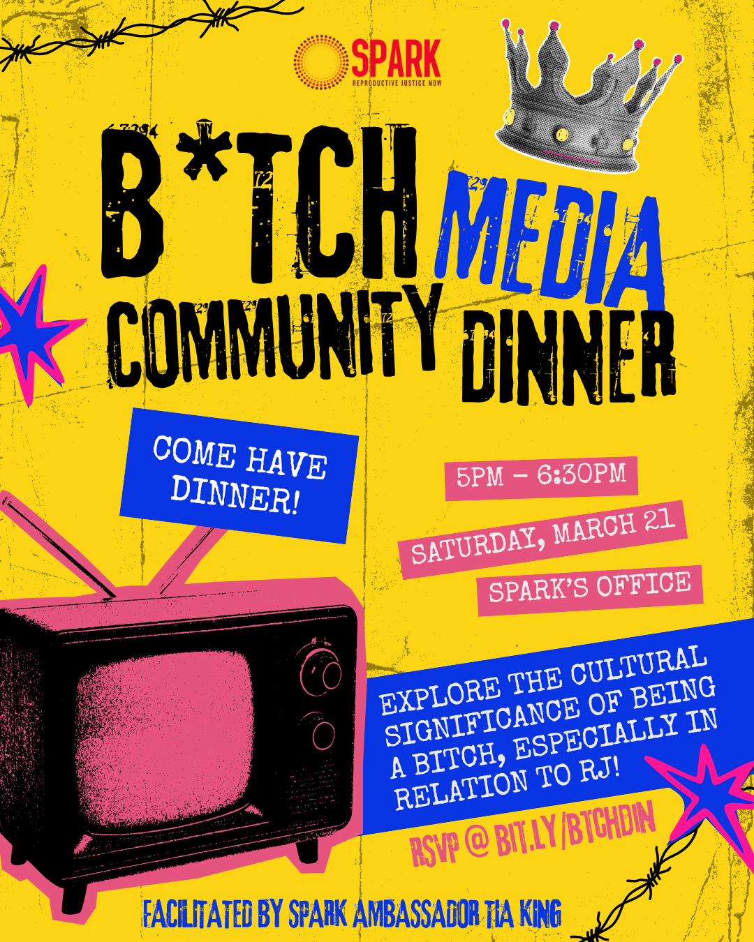 Attend a dinner facilitated by SPARK Ambassador, Tia King, exploring media by femmes that depict “bitchiness,” (i.e., sharpness, scrutiny, villainy) and identify the social and cultural significance of “mean”, “domineering” femmes in society where femininity is expected to be docile and accommodating.